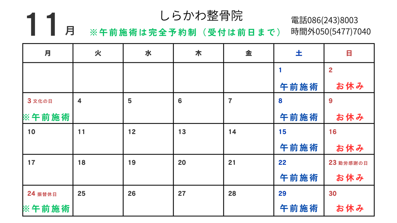 13日(月・祝)・24(月・祝)は祝日ですが、午前中のみ(完全予約制)施術を行います。上記日のご予約は前日までにお願いいたします。